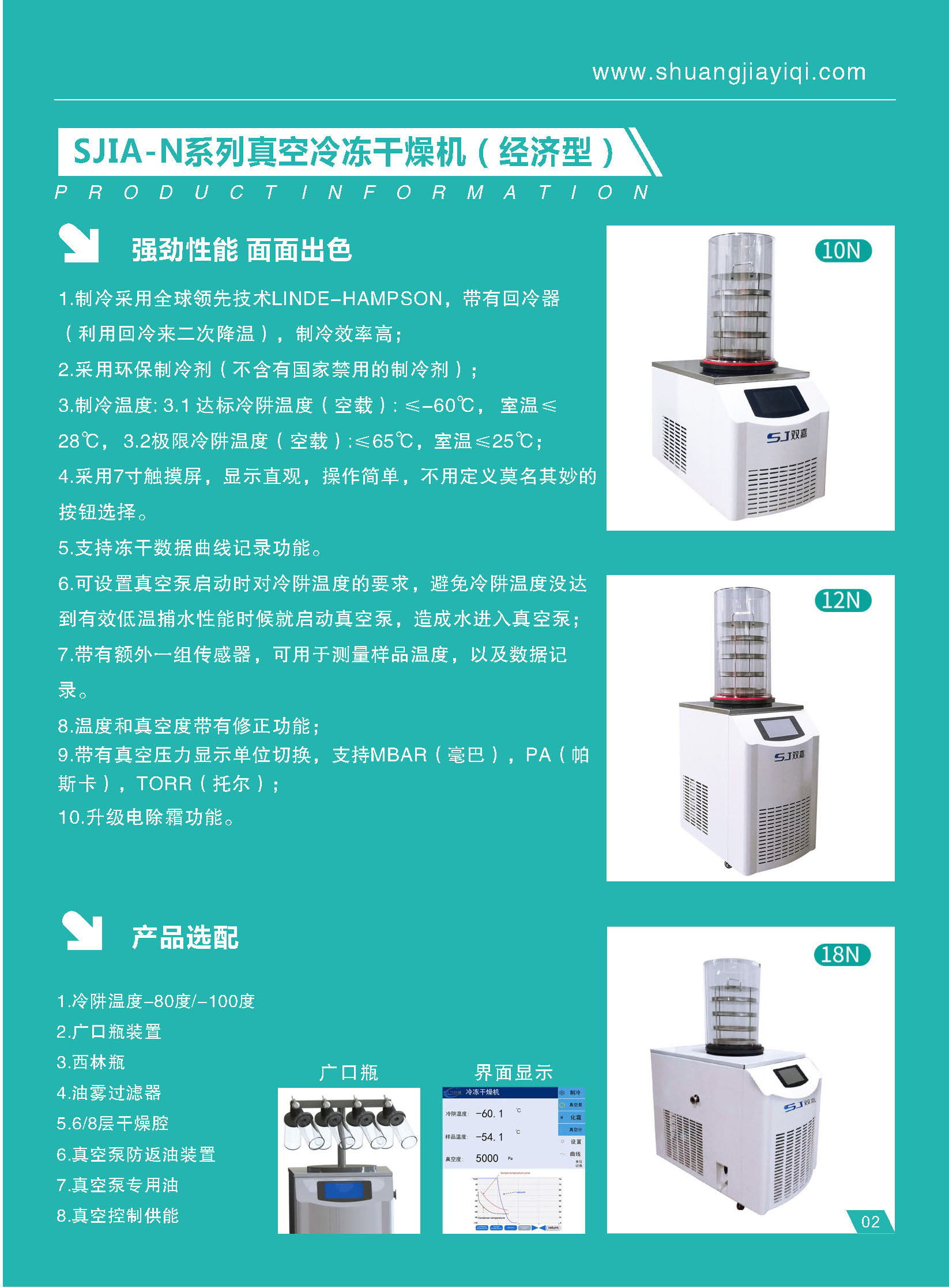 “双嘉仪"--SJIA系列冷冻干燥机包括:实验室经济型N系列真空冷冻干燥机,经济型FE系列电加热中试真空冷冻干燥机, F系列硅油加热小型生产,中试生产型,及冻干面积大于3平方的生产型真空冷冻干燥机,SJFD食品级真空冷冻干燥机,六大类真空冷冻干燥机。几十个机型能满足不同用户的需求。
